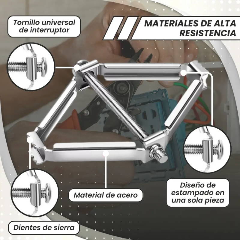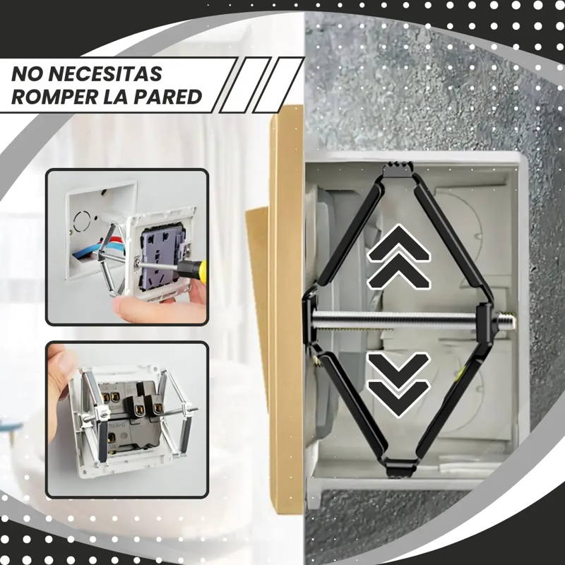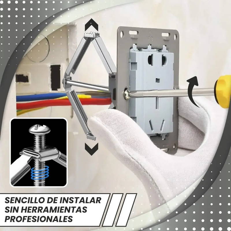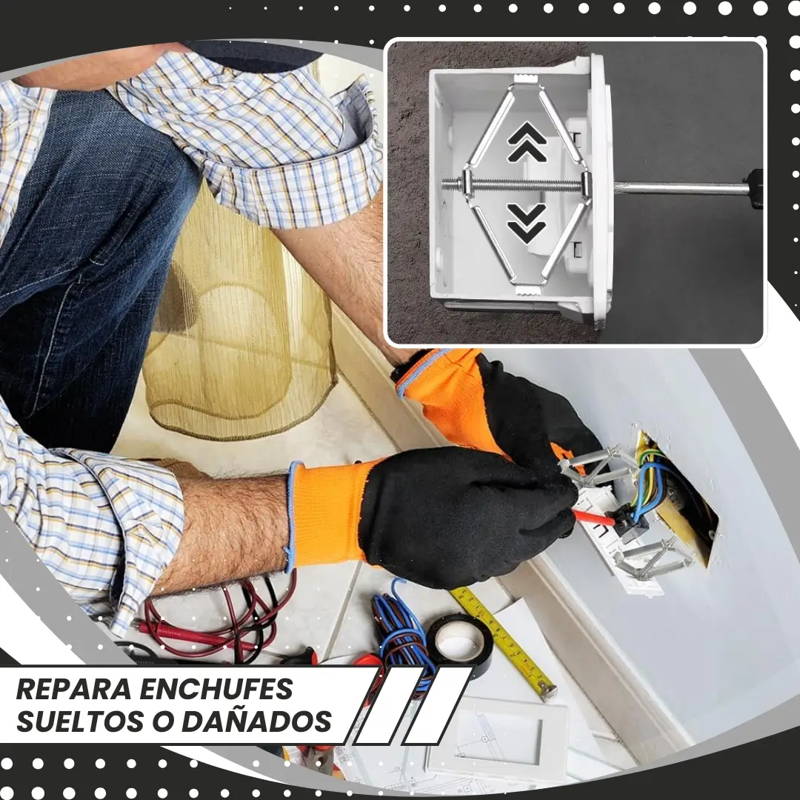Presentamos el Fijador de Enchufes, una herramienta sencilla de usar, segura y resistente, que soluciona los problemas de enchufes sueltos o mal ajustados en cajas eléctricas de pared.